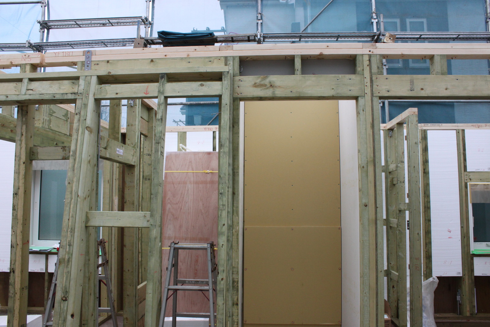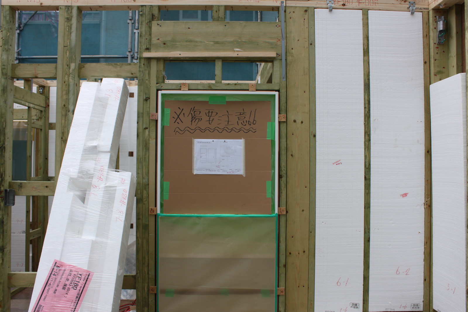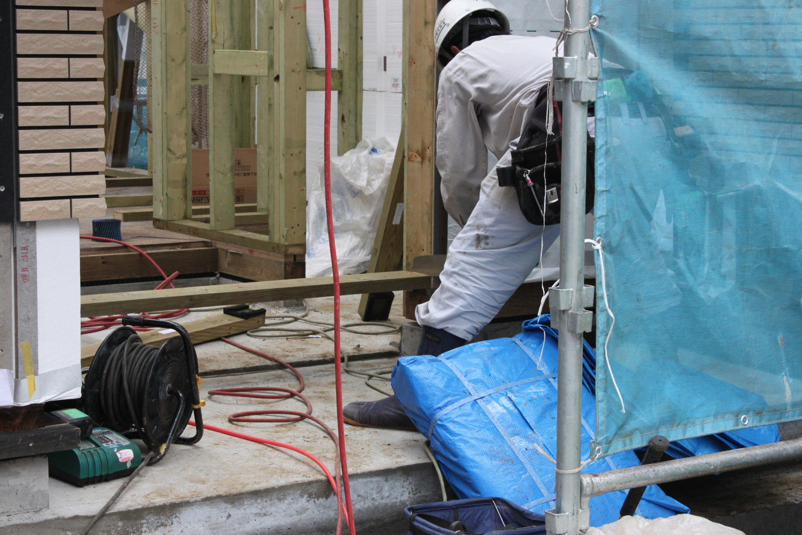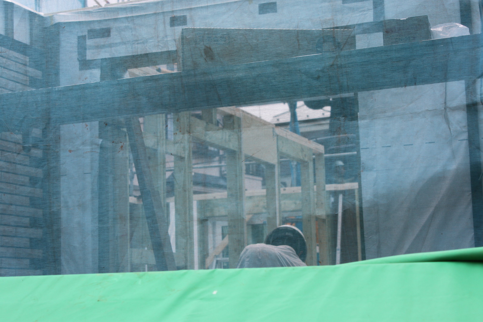 ほとんどが工場で加工されているので、のこぎりはかなり貴重だ。これは玄関部分で、ある程度組みあがってから不要な部分を切り落としている。のこぎりの音がほとんど聞こえない現場に、少しだけ響いていた。