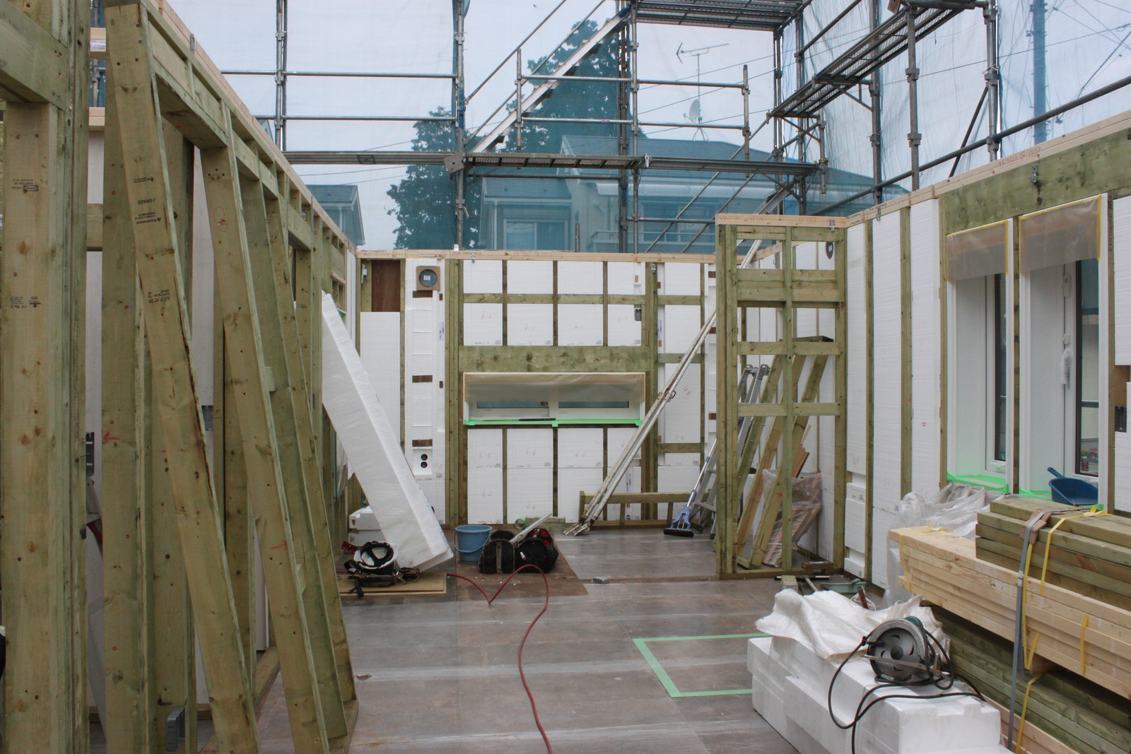 中の壁の部分になる間仕切りも、骨組みが出来上がった状態で持ってきていた。そのままクレーンで吊り上げ、どんどん中にいれて組み立てていく。あそこが和室の入口で、収納の部分でとか考えながら見ていると面白い。