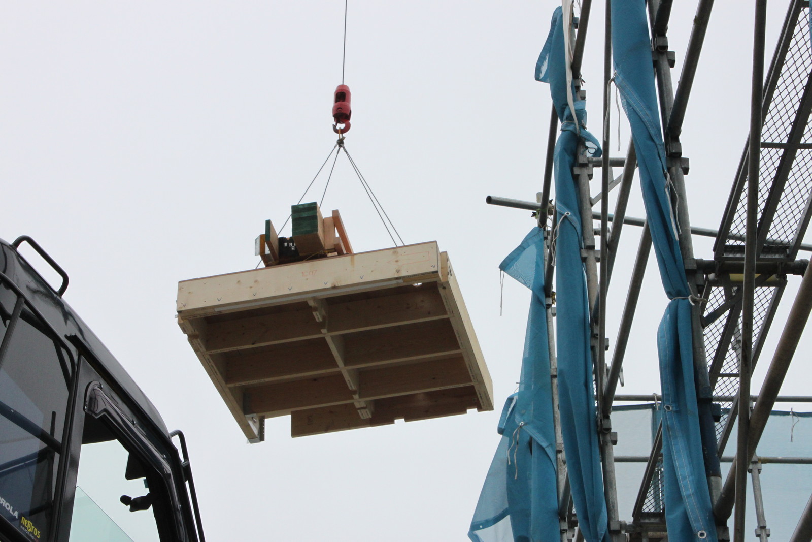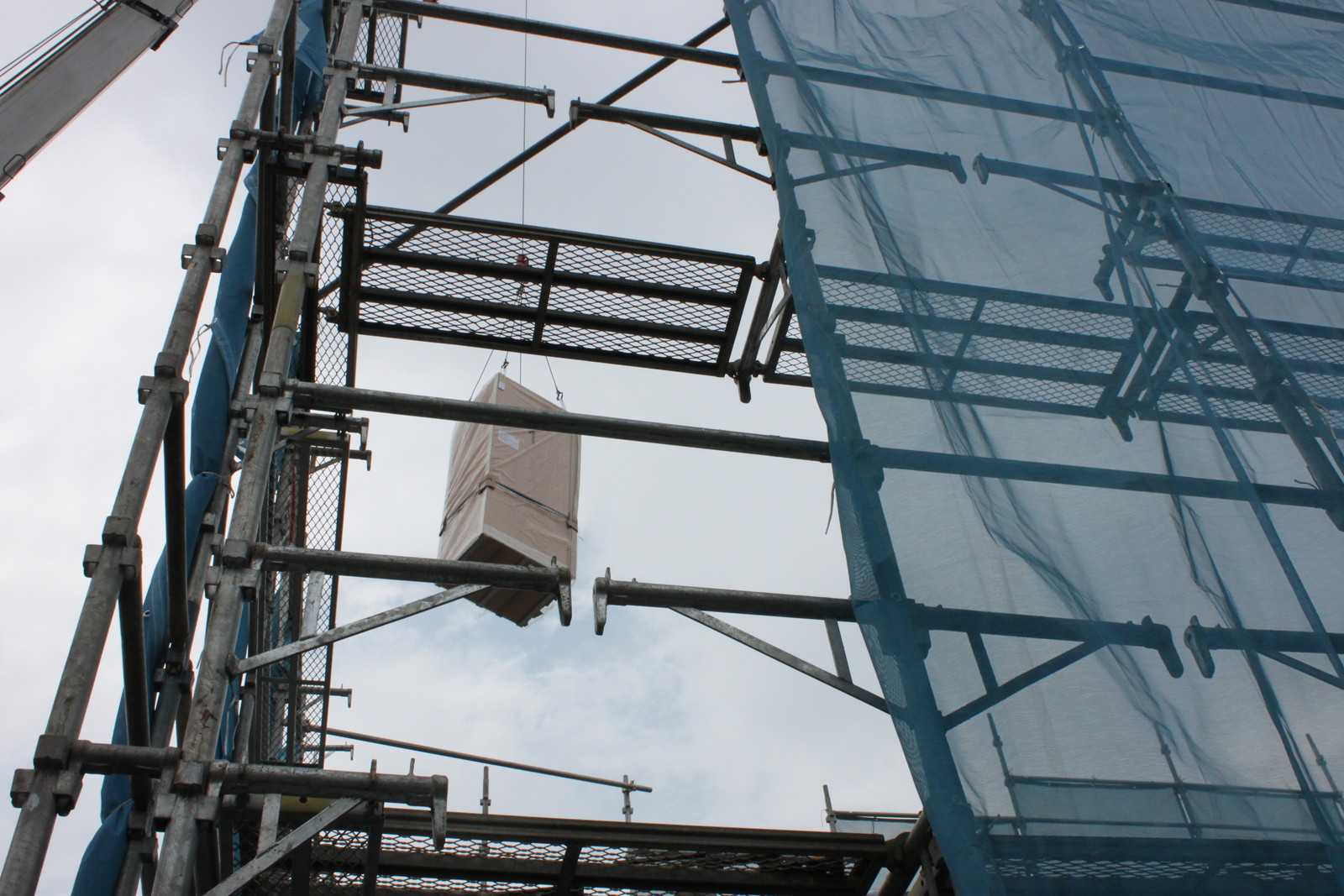 大体中に入れるものが終わると1階の天井を組んでいく。天井もいくつかに分けていて、これを組み込んでいくという感じだ。昼の休憩までに半分くらいの天井が組み込まれていた。工事開始から4時間ほどで1階のほとんどが組みあがってしまった。